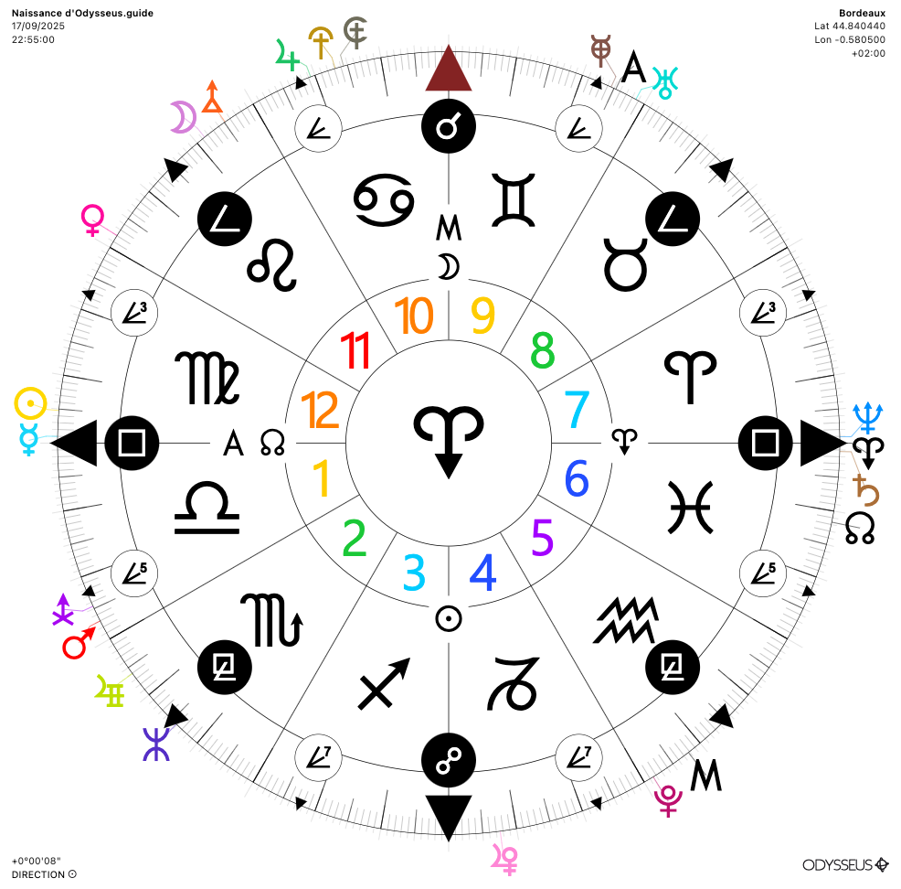 Il y a plusieurs mois de cela, je présentais à un panel réduit d’élèves et en version “bêta” mon application Odysseus®, un logiciel d’astrologie uranienne, qui était alors encore en cours de développement. Environ 6 mois plus tard, il est prêt, il est blond, il est beau, il sent bon le sable chaud, et il est disponible sur iOS (iPhone, iPad), Mac (à partir de M1), Android et Windows (10/11). Je suis infiniment fier de pouvoir vous le présenter — surtout au moment où l’École de Hambourg, mère de l’astrologie uranienne, vient de fêter ses 100 ans ! — car c’est un gros ouvrage qui vous permettra non seulement de monter vos thèmes de naissance, dirigés et transit, synastrie, composite et thème nodal, d’afficher des roues de 360º, 90º, 22º30, 5º37 et 1º24, de voir les Maisons de tous les systèmes, d’afficher les mi-points, de trouver les points sensibles ou les triples motifs, d’afficher les axes, de calculer les révolutions solaires et lunaires, les éclipses, ingrès et lunaisons, thèmes quotidien et relocalisation, d’afficher les points classiques (Point Vernal, Milieu du Ciel, Ascendant, Soleil, Lune, Nœud Lunaire, Mercure, Vénus, Mars, Jupiter, Saturne, Uranus, Neptune, Pluton), les 8 transneptuniennes (Cupidon, Hades, Zeus, Kronos, Apollon, Admète, Vulcain, Poseidon) mais aussi d’autres corps (Lune Noire, Vertex, Ceres, Junon, Pallas, Vesta, Hygiea, Chiron, Haumea, Makemake, Eris) mais aussi de lire l’intégralité des définitions apportées par le Codex®, vous donnant les interprétations des planètes, mi-points, points sensibles/figures planétaires, mais aussi des planètes dans chaque maison de chaque système. Une application complète… et le papa en est très fier 😊